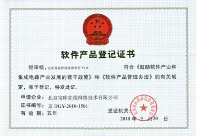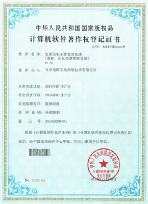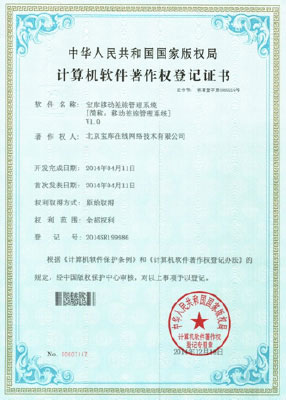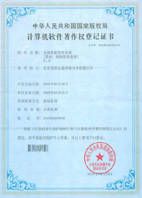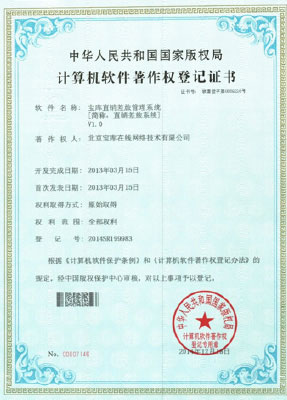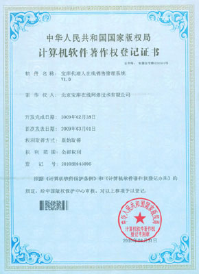 中华人民共和国国家版权局计算机软件著作权登记证书(宝库代理人在线销售管理系统V1.0)