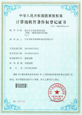 中华人民共和国国家版权局计算机软件著作权登记证书 (航空公司差旅管理系统V1.0)